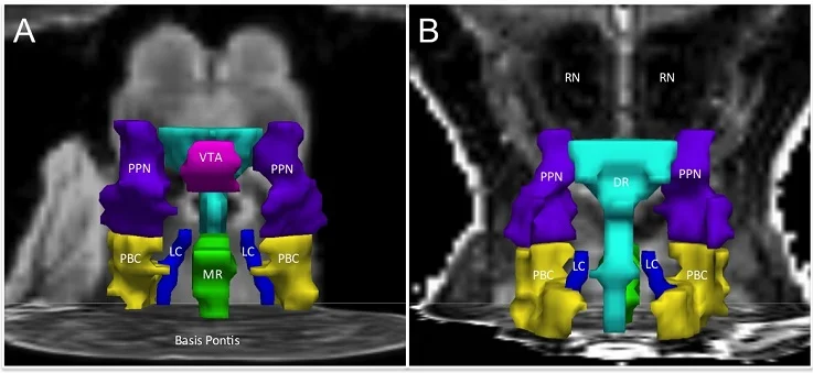 The above figure shows an anterior (front) view in panel A and a posterior (back) view in panel B of brainstem nuclei that are critical to human consciousness. These nuclei were manually traced on an ultra-high resolution MRI of a human brainstem. The locations and borders of the nuclei on the MRI dataset were correlated with microscopic analysis of the same human brainstem after it was scanned. The neuroanatomic information from this human brainstem, along with neuroanatomic data from standard atlases of the human brainstem, formed the basis for the Harvard Ascending Arousal Network Atlas (www.martinos.org/resources/aan-atlas). Figure adapted from Edlow BL, Takahashi E, Wu O, Benner T, Dai G, Bu L, Grant PE, Greer DM, Greenberg SM, Kinney HC, Folkerth RD. Neuroanatomic connectivity of the human ascending arousal system critical to consciousness and its disorders. Journal of Neuropathology and Experimental Neurology. 2012;71:531-546.